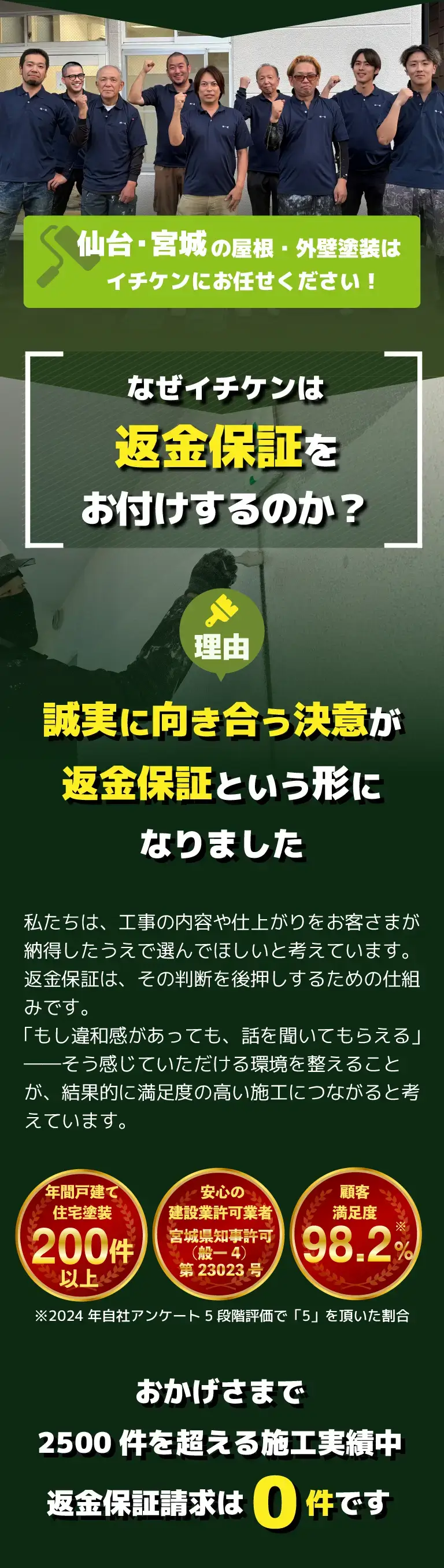 安さを売りにしている一部の業者の中には、洗浄・下塗りがおろそかであったり、上塗りも1回で済ましてしまう悪質な業者も見受けられます。イチケンではご要望に応じて2~3回の丁寧な上塗りを行います。見た目の美しさに差が生まれるだけでなく、耐久性にも大きな影響がでます。 -