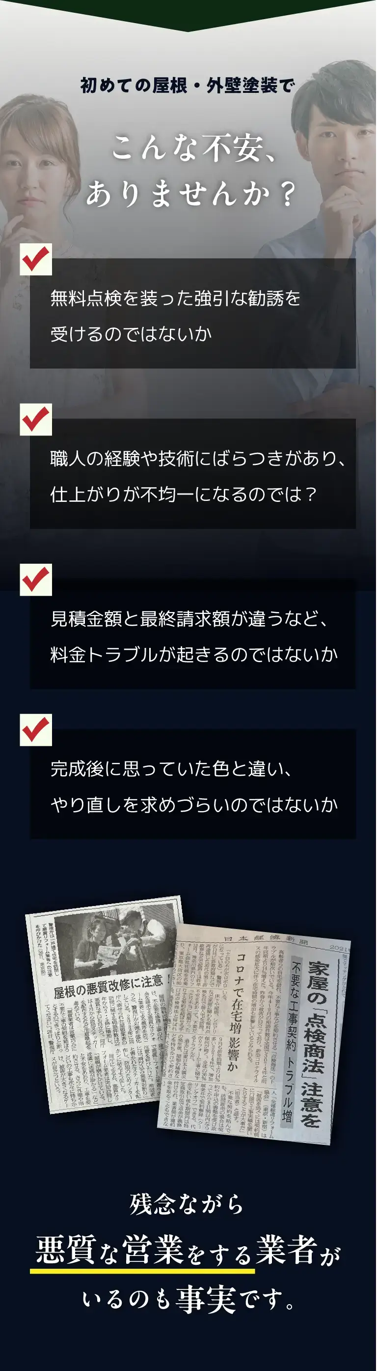 まずは屋根や外壁の塗装リフォームは、安価なものではなく、何度も行うことがない重要な作業です。そのため、失敗は避けたいものです。何か気になる点があれば、どんな質問も遠慮なくご相談ください。 -